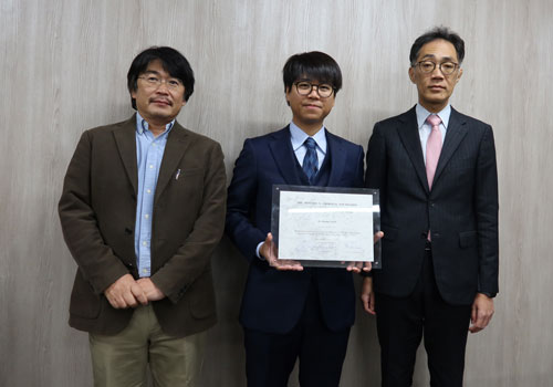 2025年12月17日(水)に、スイスの財団から届いた賞状が、島田生物生産学部長より佐藤さんへ手渡されました。