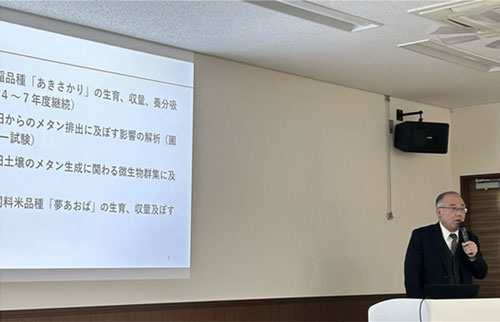 報告会には、中四国農政局、広島県農林水産局、JA(営農指導員)、全農広島県本部、広島大学からあわせて50名が出席しました。長岡准教授は、鶏ふん堆肥施用量と水稲品種「あきさかり」の生育、収量、養分吸収との関係、鶏ふん堆肥施用が水田からのメタン排出に及ぼす影響、鶏ふん堆肥施用量が飼料米品種「夢あおば」の生育、収量に及ぼす影響などに関する研究結果を報告しました。
