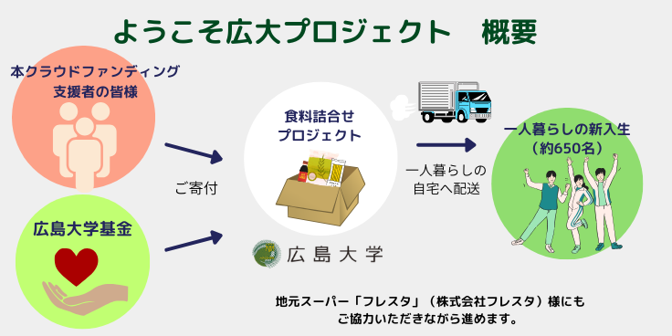 1.  今年の学部新入生で一人暮らしをする学生650人へ、広島の食材をふんだんに詰め合わせた食料品を自宅へ配送します。 詰合わせには、広島県産米 (無洗米)、ふりかけ、味噌汁、パスタソース、缶詰など、学生が手軽に自宅で食べられるものや、料理を楽しんでもらえる内容を予定しています。