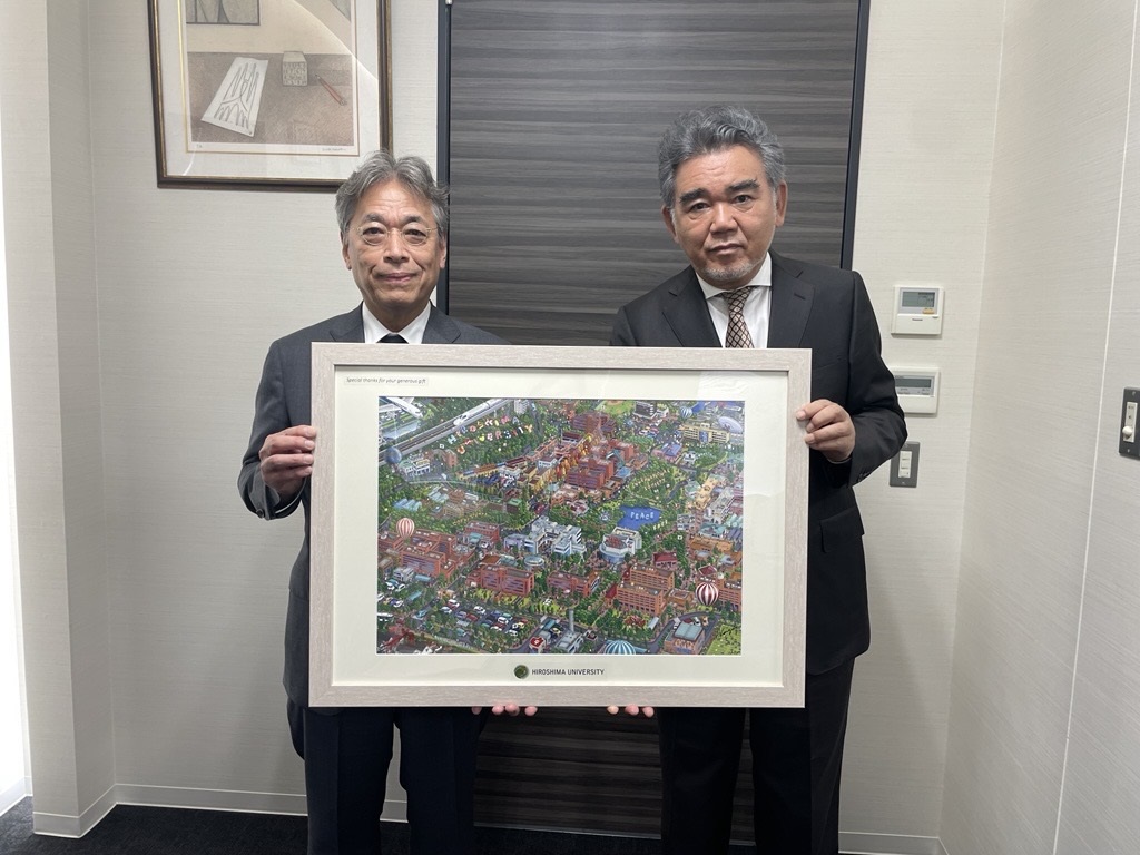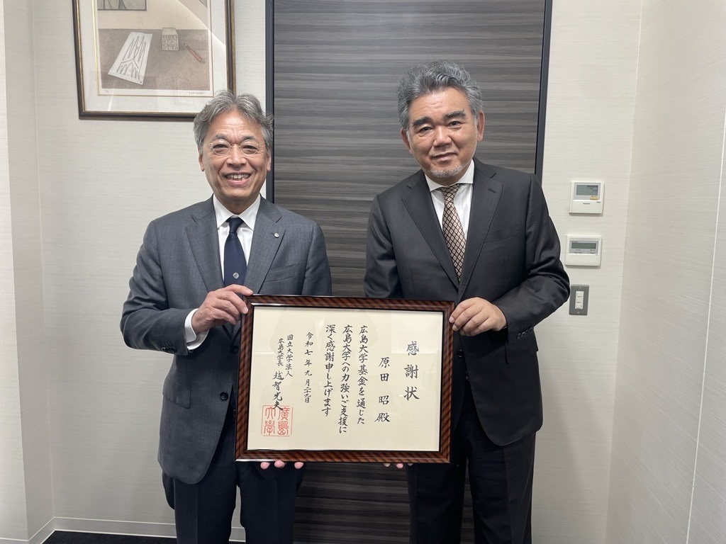 原田様におかれましては、このたび「広島大学が躍動し広島の地を活性化させる基金」の趣旨にご賛同くださるとともに、多大なるご支援を賜りましたことから、感謝の意を表し、名誉校友の称号と感謝状を贈らせていただきました。